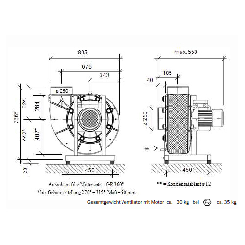 Direktgetriebener Radialventilator zur Förderung aggressiver und explosionsfähiger Gase, Temperatur max 40°C Ventilator II 3G c IIB T3 X 05 ATEX D085 Gehäuse aus PPs, in gespritzter Ausführung mit integrierten Dichtungssystem, bestehend aus Kondensatwehr als umlaufende Tropfkante und einer Labyrinthdichtung, mit zusätzlicher Fettsperre, von aussen nachfüllbar, und Lippendichtung, Kondensatablaufstutzen an der tiefsten Gehäusestellung Laufrad mit rückwärtsgekrümmten Schaufeln aus PPs, in gespritzter Ausführung mit Rückenbeschaufelung für garantierten Unterdruck an der Wellendurchführung im Betrieb, Gehäusestellung GR, Ausblasrichtung 45° / 90° / 135° / 180° / 270° / 315° /360° Grundrahmen: Stahl-verzinkt Antrieb : Normmotor ATEX- konform EEx e II 2G T3 3 x 230/400V, 50 Hz, IP55, Wärmeklasse F, Zubehör : Gummi -Schwingungsdämpfer saug- und druckseitige Schutzgitter sind bauseitige Leistung durch Kunden Volumenstrom m3/h 380 - 2500 Druckdifferenz PA 500 - 130 EEx e II T3 Polzahl 4 Sync. Drehzahl bei 50 Hz 1500 1/min Motorleistung kW 0,37 Nennstrom bei 400 V 1,08 A Baugröße 71 Bauart B5 / IP55 |