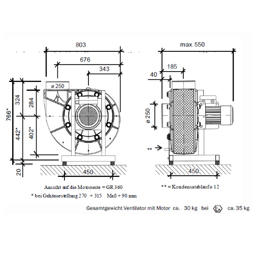 Gehäusestellung GR,  Ausblasrichtung 45° / 90° / 135° / 180° / 270° / 315° /360°