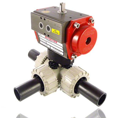 | 3/2-Wege-Kugelhahn aus PP mit pneumatischem Stellantrieb Funktion: doppelt wirkend, inklusive optischer Stellungsanzeige Kugel mit L-Bohrung Standardkugelstellung: 1 Steuerdruck: Standard 5 bar reduzierter Steuerdruck: auf Anfrage Steueranschluß: G 1/8' Namur (DN15) G 1/4' Namur (DN20 - DN50) Anschluss: PE-LS-Stutzen zum Heizelementstumpf- und Heizwendelschweißen Dichtung PTFE/FPM |