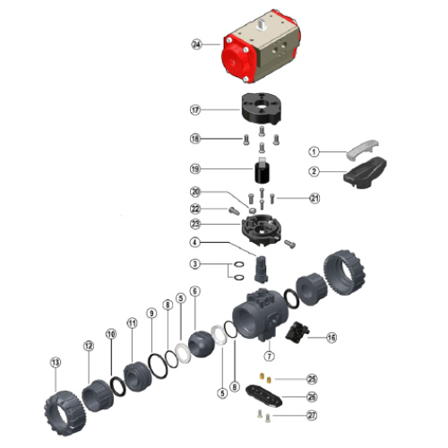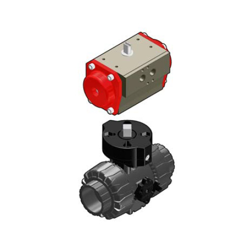 2/2-Wege-Kugelhahn mit gesicherten Überwurfmuttern aus PP mit pneumatischem Stellantrieb