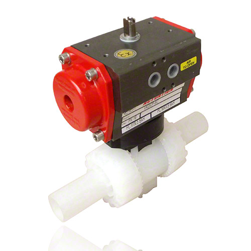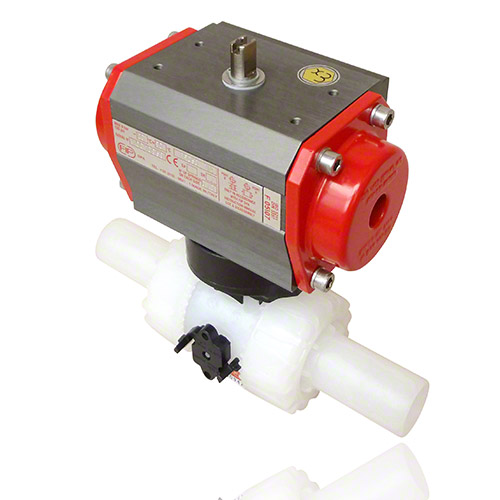 2/2-Wege-Kugelhahn mit gesicherten Überwurfmuttern aus PVDF mit pneumatischem Stellantrieb