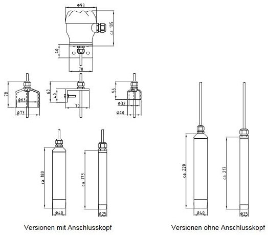 - Werkstoffe: Befestigungswinkel / Rohrkappe = PVC Fühlerteil = PVC (LW CX 25) / PE (LW CX 40)