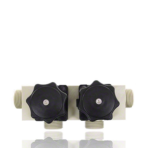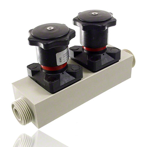 Mehrwegeventil aus PP mit zwei Handantrieben, Abgang reduziert, Membrane PTFE
