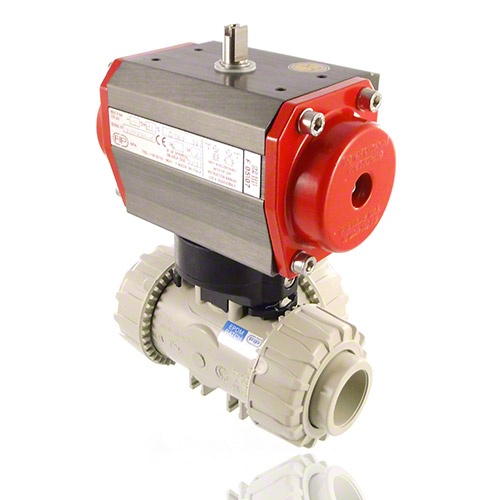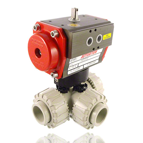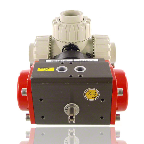 | 3-Wege-Kugelhahn aus PP mit pneumatischem Stellantrieb Funktion: doppelt wirkend, inklusive optischer Stellungsanzeige Kugel mit T-Bohrung Standardkugelstellung: 1 Steuerdruck: Standard 5 bar reduzierter Steuerdruck: auf Anfrage Steueranschluß: G 1/8' Namur (DN15) G 1/4' Namur (DN20 - DN50) Anschluss: Schweißmuffe zum Heizelementmuffenschweißen Dichtung PTFE/FPM |