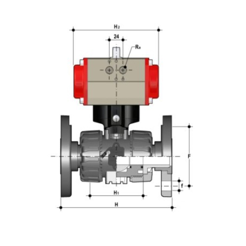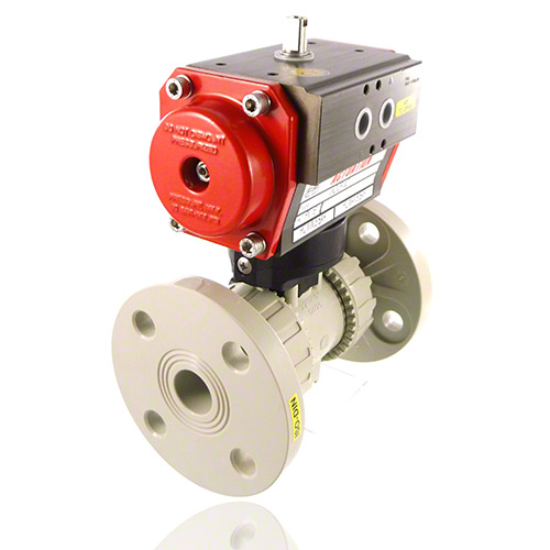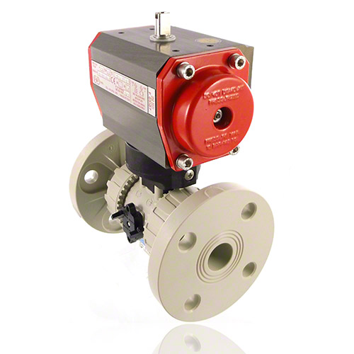 2/2-Wege-Kugelhahn mit gesicherten Überwurfmuttern aus PP mit pneumatischem Stellantrieb