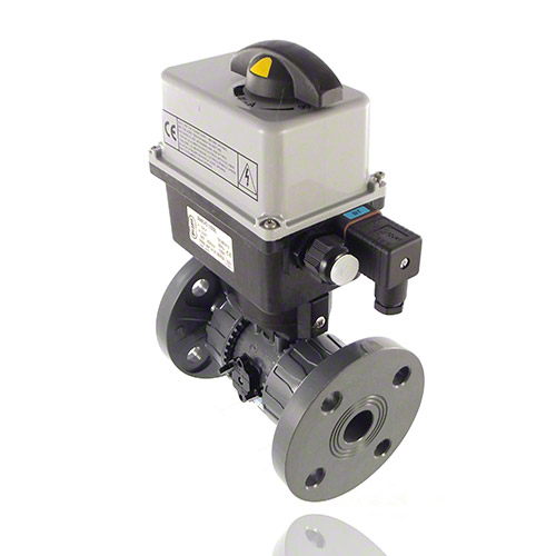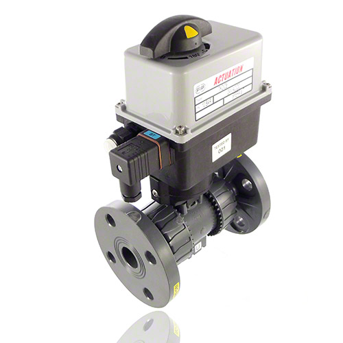 2/2-Wege-Kugelhahn mit gesicherten Überwurfmuttern aus PVC-U mit elektrischem Stellantrieb