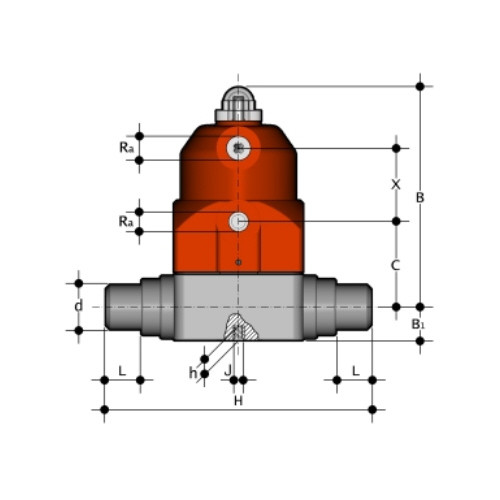 | 2/2-Wege-Membranventil mit pneumatischem Stellantrieb und optischer Stellungsanzeige Gehäusewerkstoff: PVDF Funktion: normal geschlossen (NC) Membranwerkstoff: wahlweise EPDM - FKM - PTFE/EPDM Steuerdruck: 4 - 7 bar Steueranschluss: R 1/4' Steueranschluss in Durchflussrichtung: auf Anfrage Betriebsdruck: einseitig anstehend Anschluss: Schweißstutzen zum Heizelementmuffenschweißen |