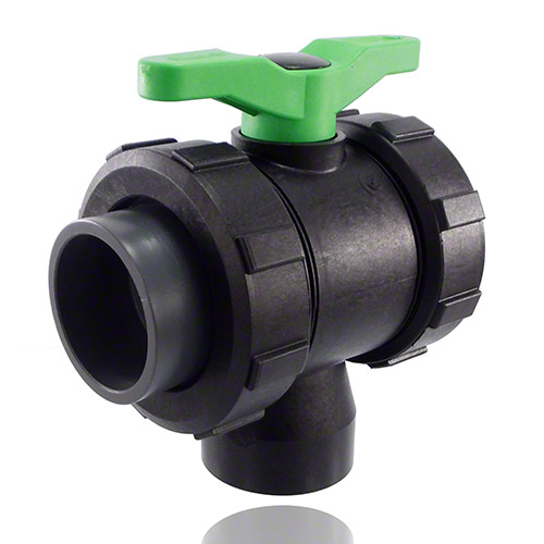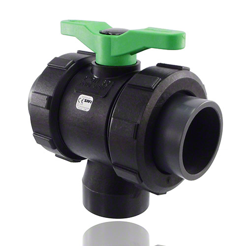 3-Wege-Kugelhahn PPGF, PVC-U-Klebemuffen, FPM = grüner Hebel