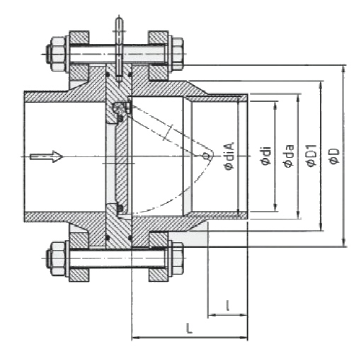 - Dichtung: EPDM Einbau eingangsseitig an Bundbuchse ISO/DIN mit flacher Dichtfläche, ausgangsseitig an Austrittshilfe Beruhigungszone von mind. 5 x Nenndurchmesser (DN) vor und nach der Rückschlagklappen Keine direkte Montage auf Pumpenflansch oder nachfolgenden Bögen Für dichtschließende Rückschlagklappen ist ein Differenzdruck vom mind. 0,3 bar erforderlich, bei geringeren Differenzdrücken bitte Rücksprache halten - Max. zulässiger Betriebsüberdruck bei Wasser und 20°C von 6 bar - Öffnungsdruck vertikal in mbar -Installationsanleitung beachten - weitere Abmessungen auf Anfrage - Rückschlagklappe mit Feder aus Hastelloy 2.4610 auf Anfrage |