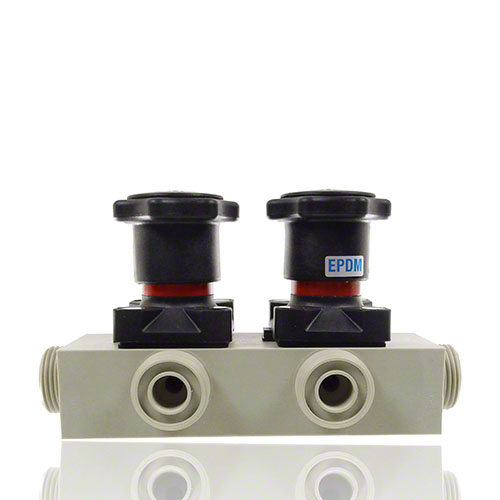 Mehrwegeventil aus PP mit zwei Handantrieben, Abgang reduziert, Membrane PTFE